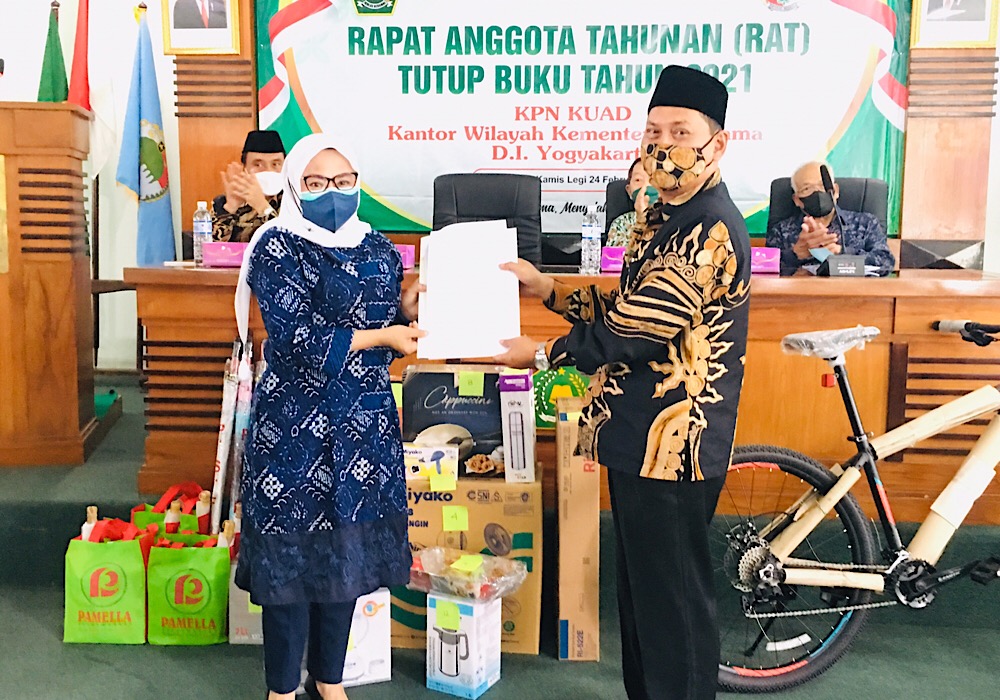 Yogyakarta (Humas Kemenag DIY)—Koperasi Pegawai Negeri Kantor Urusan Agama Daerah (KPN KUAD) Kantor Wilayah Kementerian Agama DIY dinyatakan sebagai koperasi sehat. Penegasan ini diberikan oleh Dinas Perindustrian Koperasi UKM Kota Yogyakarta saat Rapat Anggota Tahunan (RAT) dan Tutup Buku Tahun 2021 yang digelar Kamis (24/2/2022). Acara digelar hybrid dengan luring di Aula Lantai lll Kanwil Kemenag DIY dan daring melalui zoom.